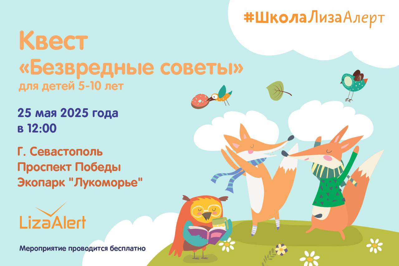 Квест по детской безопасности «Безвредные советы» от Школы «ЛизаАлерт» для детей от 5 до 10 лет 25 мая в 12:00 по адресу: г. Севастополь, Экопарк «Лукоморье».